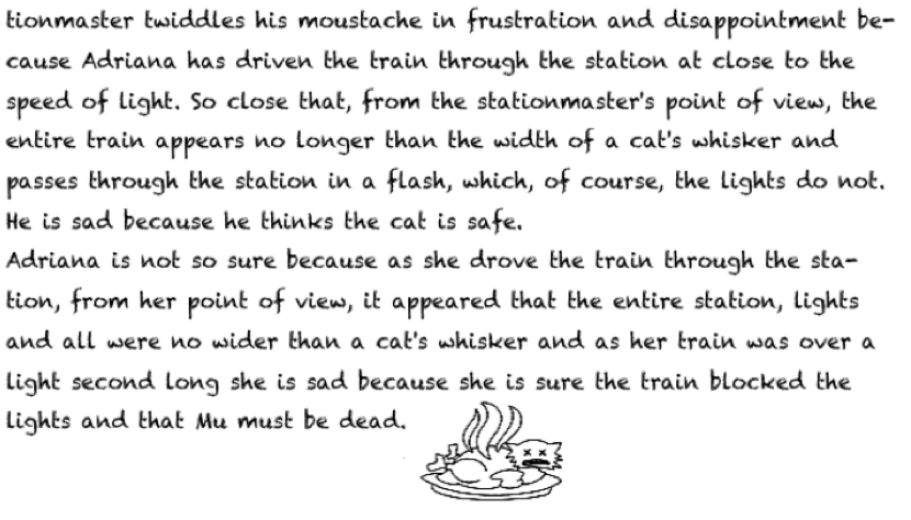 To this end I thought I might show you how one well known physicist, a man who has authored well over a hundred physics papers and articles, responded to this section, in my book (shown above). It’s a great example. So in response to the quiz and in particular to the first question (about whether or not a train blocked the lights) he states the following: