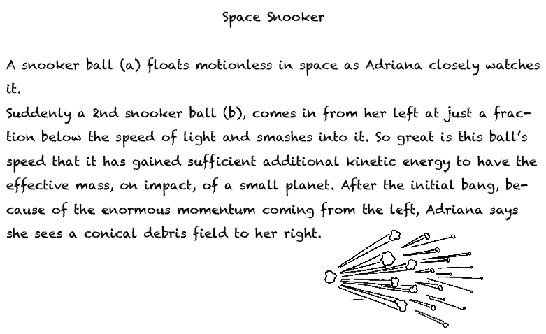 “2. So sure, in the center-of-mass reference frame, the debris field is spherical. But it is evolving with time. So when you transform it into a moving reference frame, velocities change and the field becomes lopsided in that reference frame. This doesn’t even have anything to do with relativity theory.”