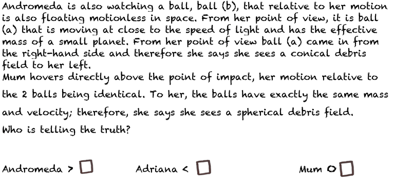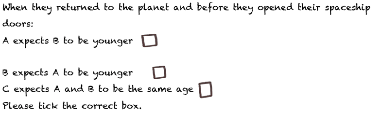 Now I’m not arguing against relativity, that would be ridiculous. No, I’m just observing that these people, actually, really don’t get it! It’s as if they know everybody thinks they do and they are keen to keep it that way. Hence the responses above!  So no boxes ticked and, of course, no explanation for the choice of box.
